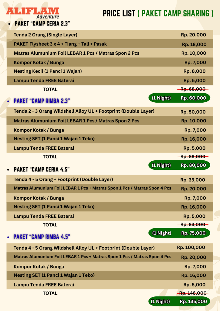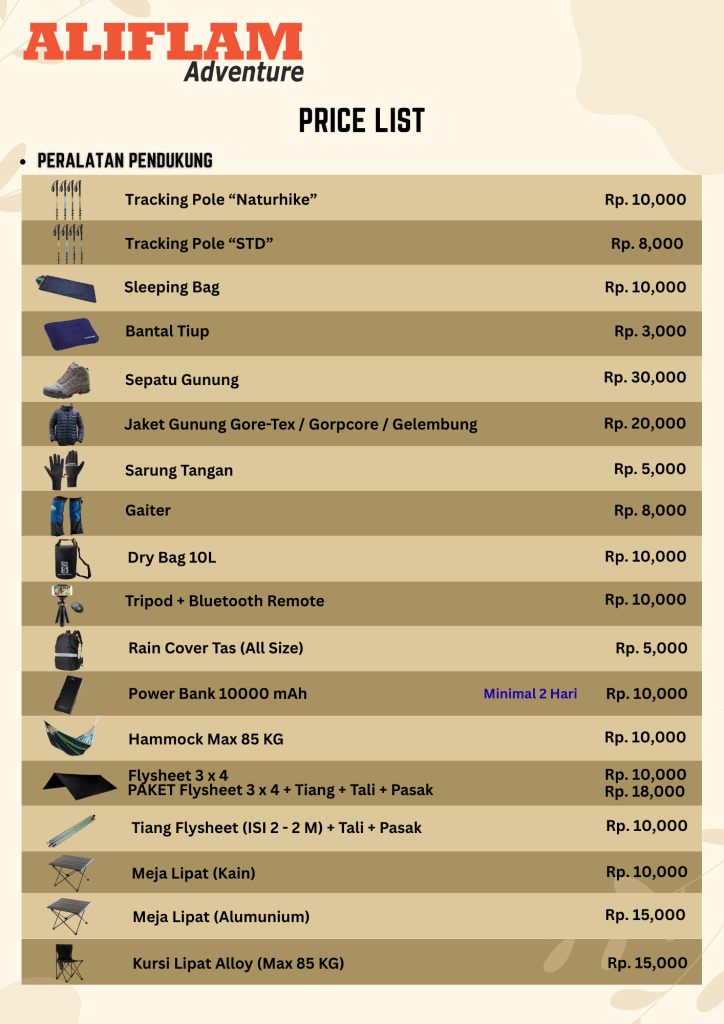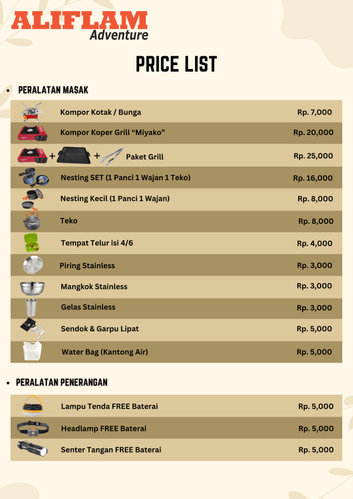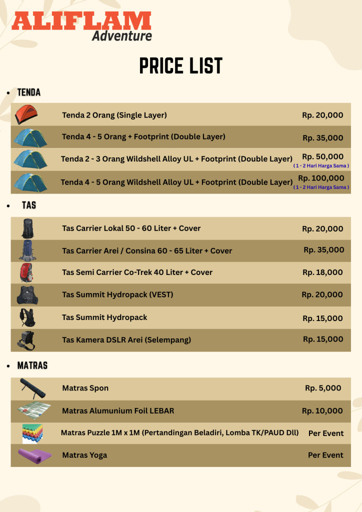 Harga Sewa Alat Camping Sidoarjo Posted on 18 October 2025 by aliflam sport Price Llist ALIFLAM Adventure (Update 9 September 2025) BOOKING SEKARANG HARGA PAKETAN “LEBIH HEMAT ! “ BOOKING SEKARANG Share this: Click to share on WhatsApp (Opens in new window) WhatsApp Click to email a link to a friend (Opens in new window) Email Click to share on Facebook (Opens in new window) Facebook Click to print (Opens in new window) Print Related